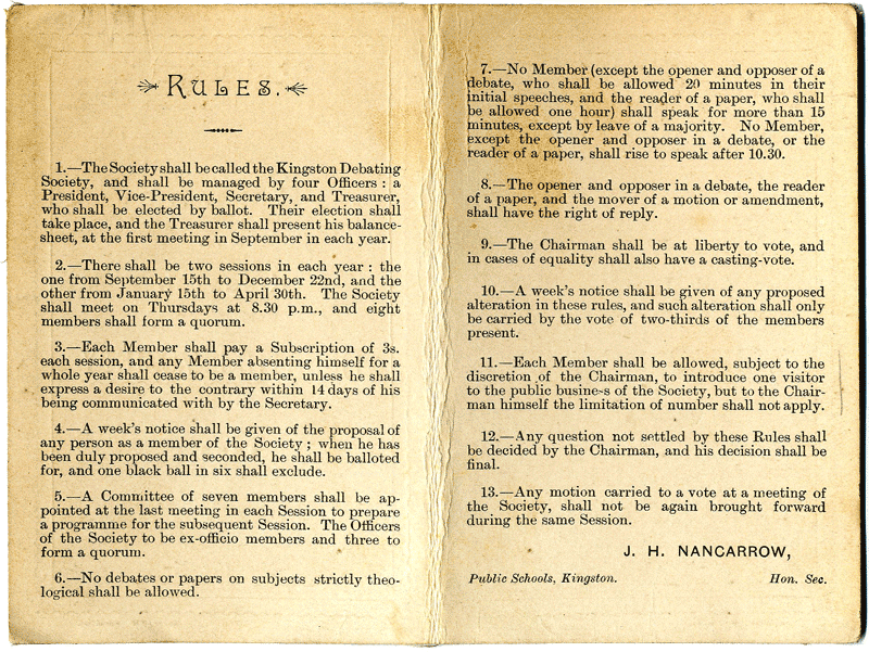 Kingston was one of very many literary and parliamentary debating societies flourishing in the late 19th century. Nearby in this part of Surrey were the Richmond Athenaeum (which lasted 1881–1939), the Wimbledon Athenaeum and the inviting-sounding Kew Coterie. This last group did not engage in debate so much as ‘light papers’ over ‘tea and light refreshments’.